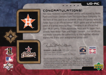 #UD-RC Dual Materials Game Used Autographed ( w/ Roger Clemens ) ( /10 )
